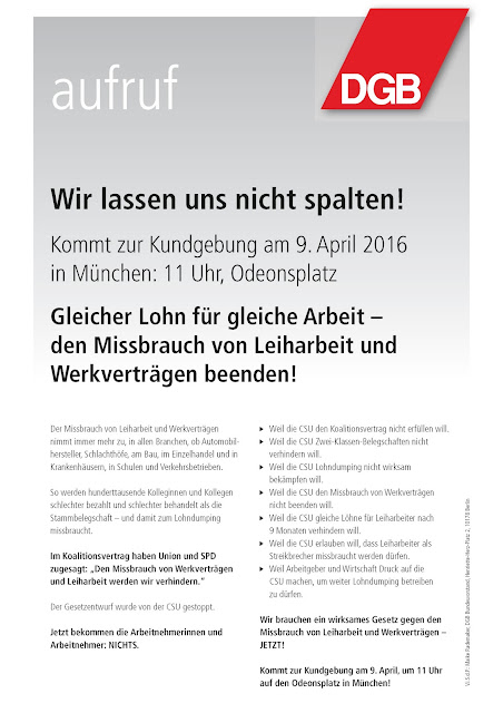 Eine sinnvolle Nutzung der Leiharbeit und Werkverträge stellt niemand in Frage. Wo jedoch Löhne gedrückt, Arbeitnehmerrechte unterlaufen und Mitbestimmungsrechte ausgehebelt werden, ist die Grenze deutlich überschritten. Leiharbeit muss auf seine Kernfunktion der Spitzenabdeckung zurückgeführt werden. Werkverträge müssen besser von der Leiharbeit abgegrenzt werden. Der DGB Bayern fordert von den politisch Verantwortlichen, dem systematisch betriebenen Missbrauch von Leiharbeit und Werkverträgen endlich ein Ende zu setzen.Koalitionsvertrag dank CSU auf Eis